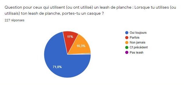 Seul 7% des riders utilisent un leash en permanence, ils sont majoritairement (63%) d'un niveau débutant ou intermédiaire. Le leash est utilisé :
