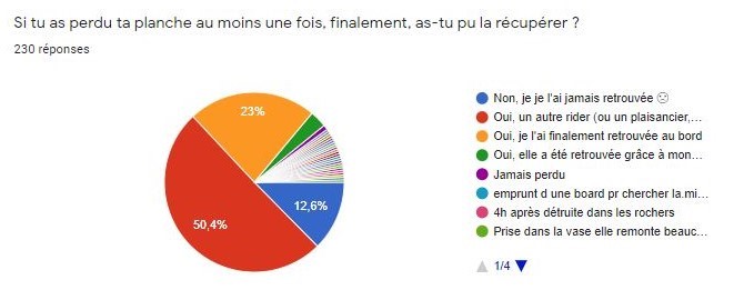 Pour ceux qui ont perdu leur planche au moins une fois, 13% des planches l'ont été définitivement. Cela fait quand même 29 planches… Dans la moitié des cas le rider a pu la récupérer immédiatement grâce à l'aide d'un tiers (en général, un autre rider). Un quart l'a retrouvée au bord et 3% grâce au numéro de téléphone inscrit sur la planche. Une bonne raison supplémentaire pour inscrire ses coordonnées sur son matériel…