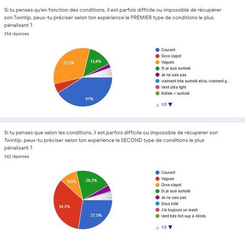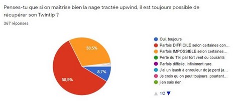 Seul 9% des riders considèrent que si on maîtrise bien la nage tractée upwind, il est toujours possible de récupérer son Twintip. Ces 9% naviguent majoritairement en méditerranée (Je n'ai pas vérifié s'ils étaient tous de Marseille 😉). Cette difficulté à récupérer parfois sa planche correspond sans doute à la réalité quand on constate le nombre d'annonces de planches perdues.